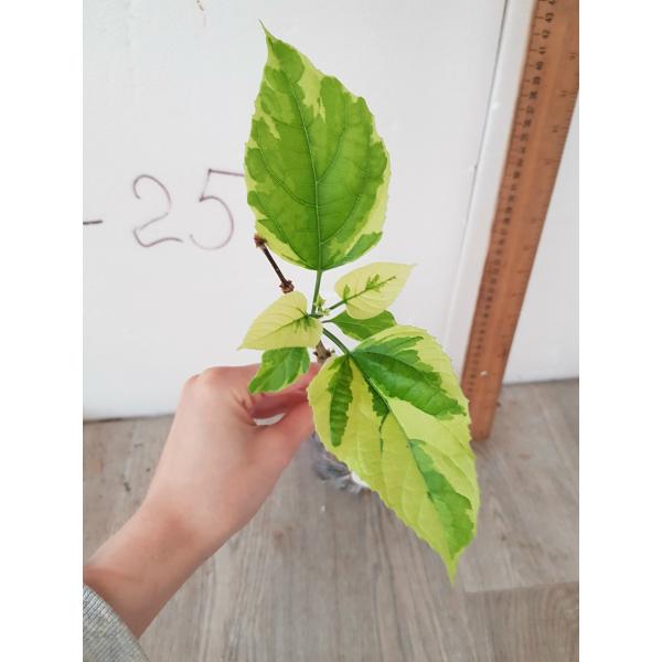 Как на фото, в пакете. Название на русском: Клеродендрум паникулатум варегатный.