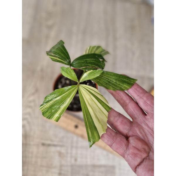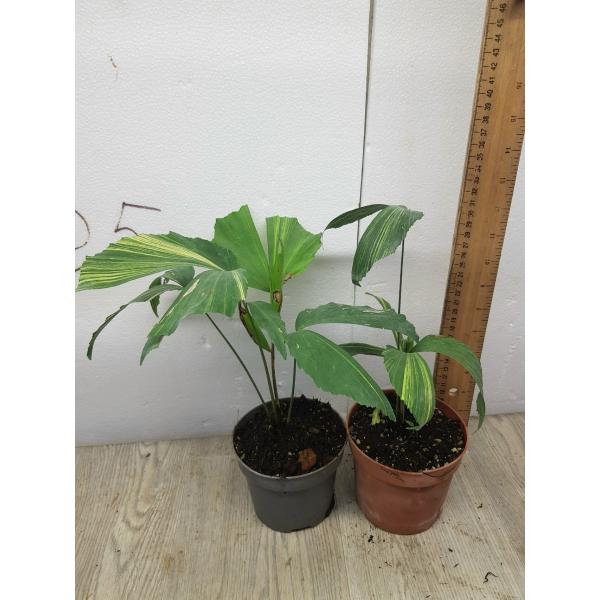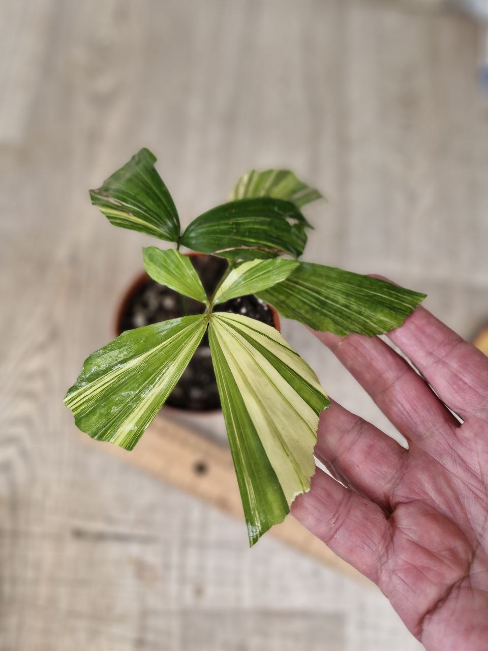в горшке, как на фото маленькое растение. Название на русском: Кариота Варегатная.