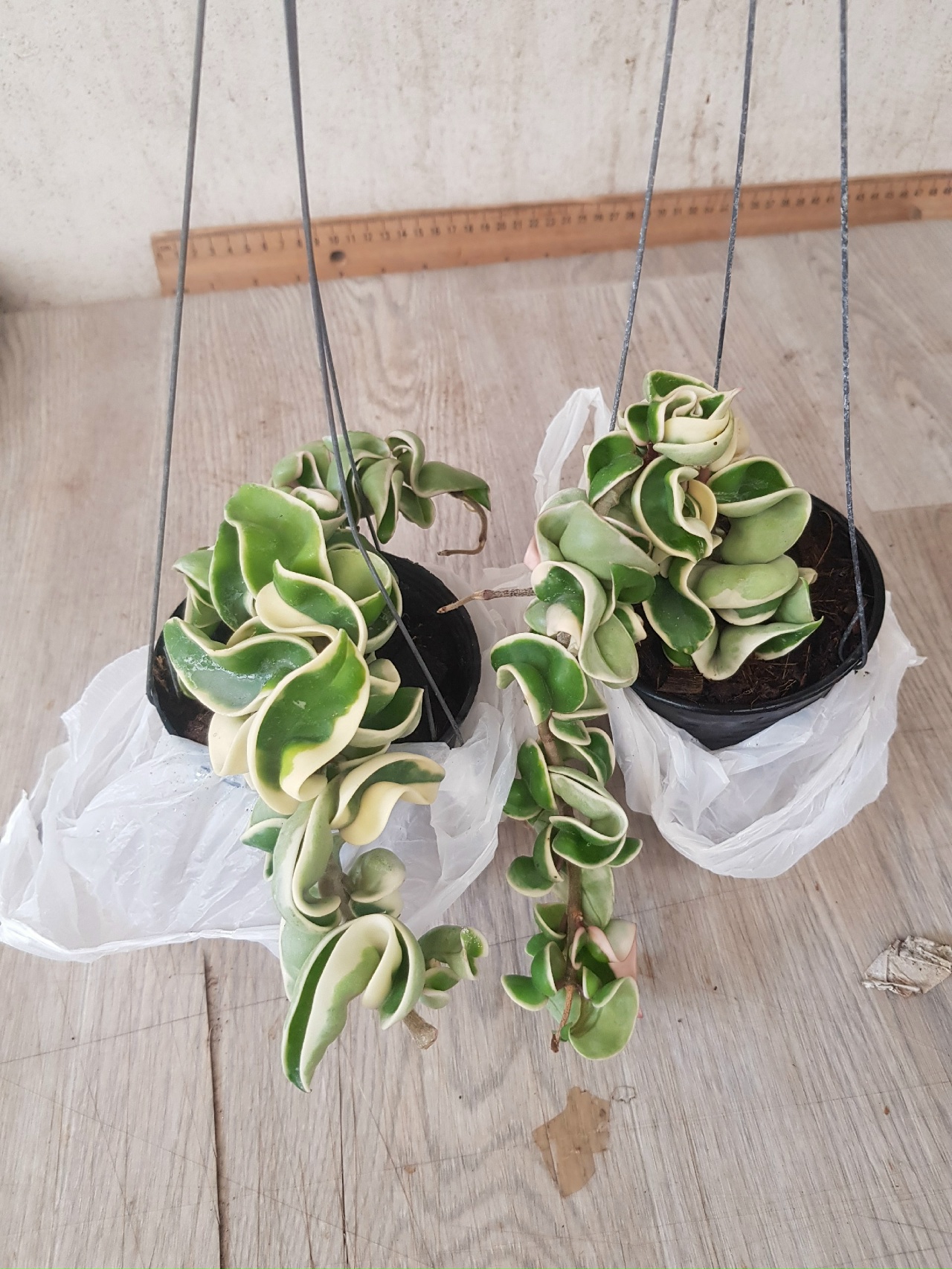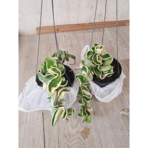 как на фото, в горшке на куске кокоса. Название на русском: Хойя Индиан Роп белый край.