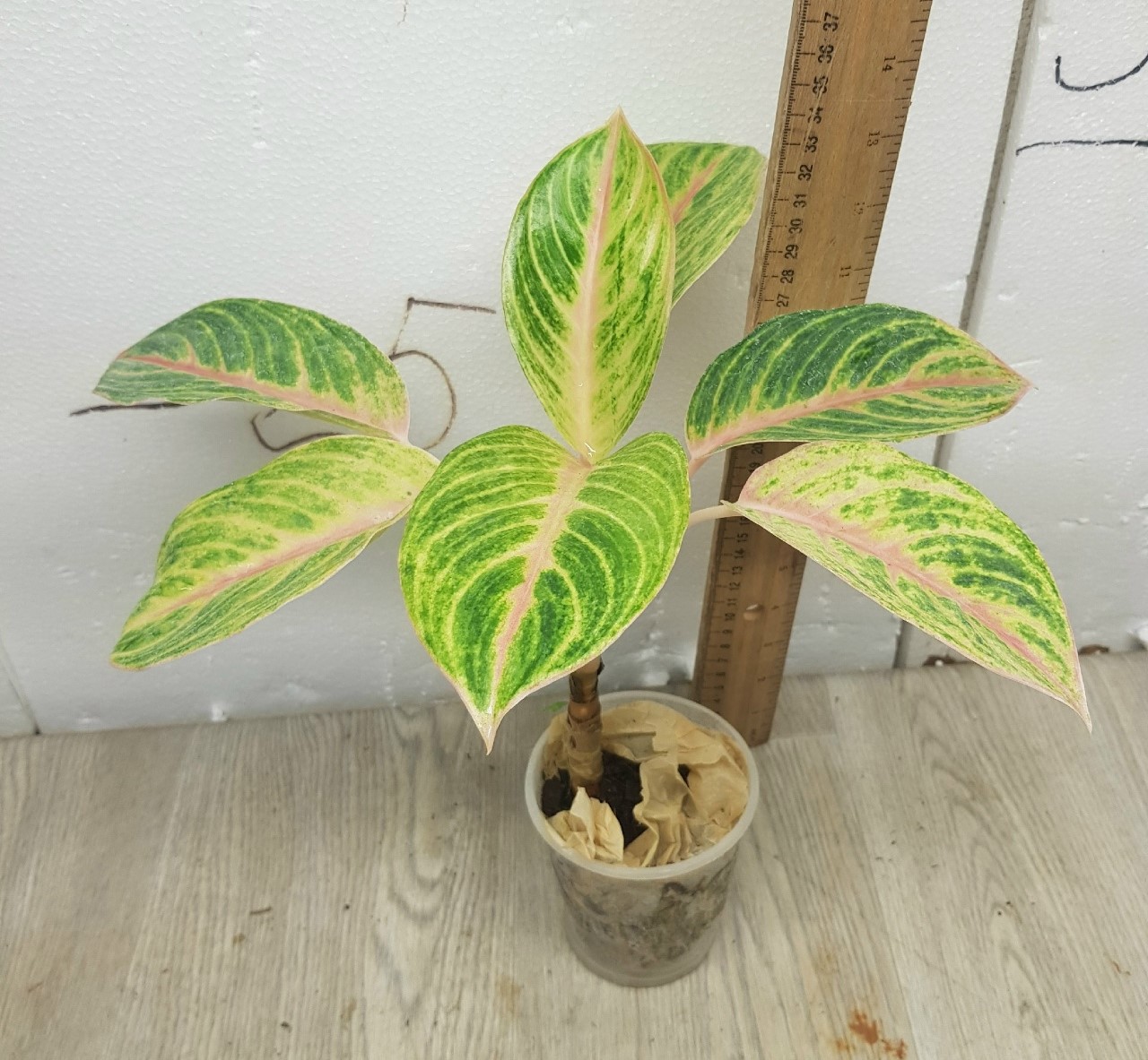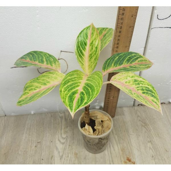 как на фото. в стакане. Название на русском: Аглаонема Голден Бей (Golden - с англ. "Золотой", Bay - с англ. "Залив")