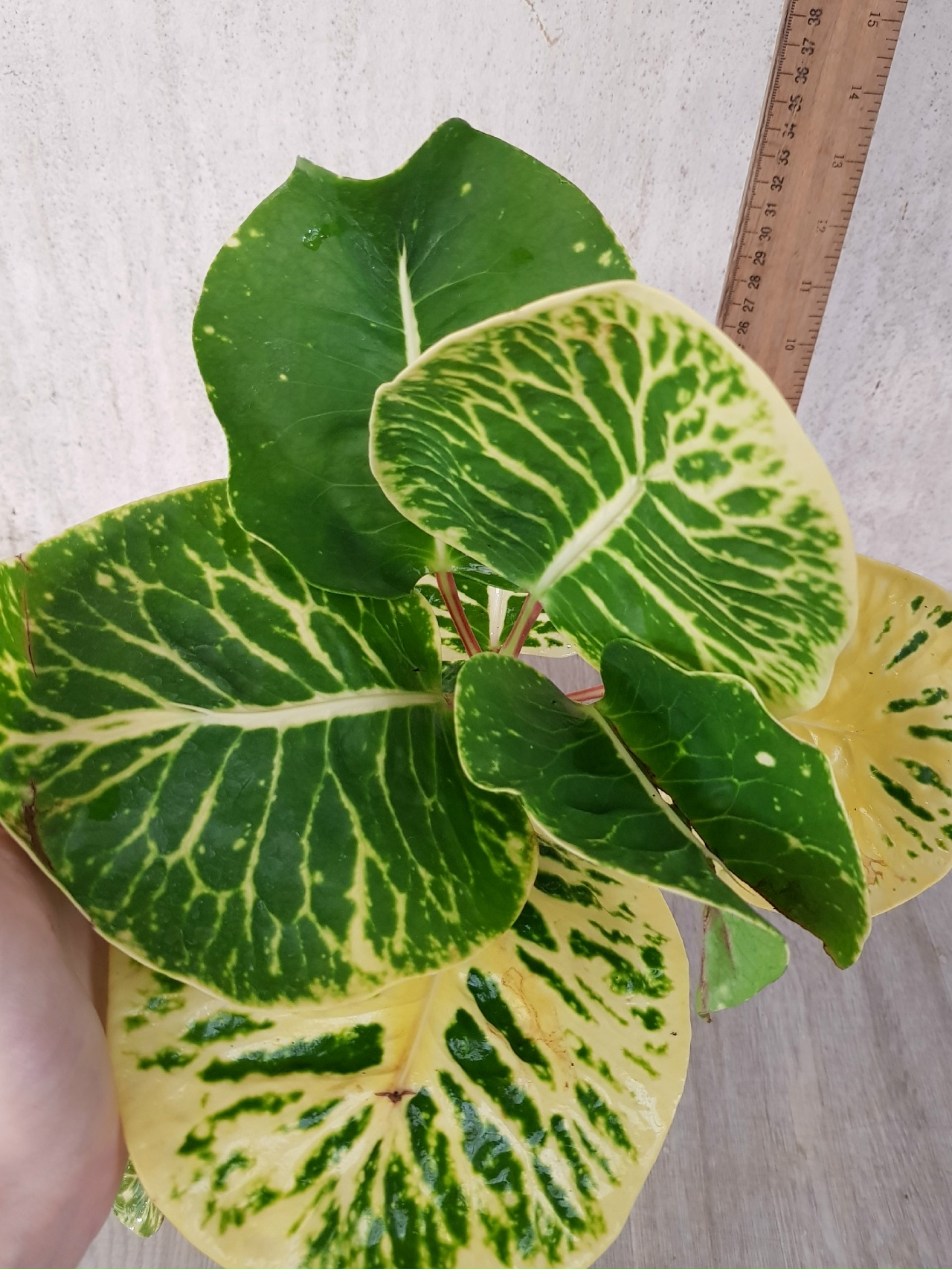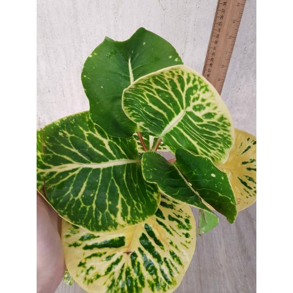 При хорошем освещении листья от жилок окрашиваются в желтый цвет. Листья у оснований имеют розоватый оттенок.