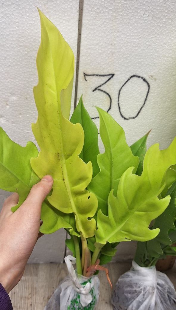 Как на фото, в пакете. Название на русском: Филодендрон золотой крокодил.